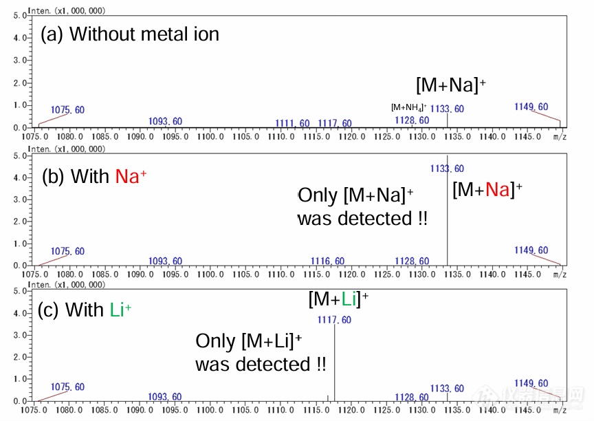 在流动相中添加Na+或Li+会通过阳离子化增加钠或锂加合物的形成。为了获得所需的离子[M+Na]+或[M+Li]+ ,可在流动相中加入微量碱金属。下图为不同流动相条件下CTX1B的分析示例,本研究中分析的其他目标化合物也获得了相同的结果。当向流动相中添加Li+时,未检测到 [M+Na]+。这些结果表明,可以通过使用[M+Li]+等替代离子来实现更高的灵敏度。