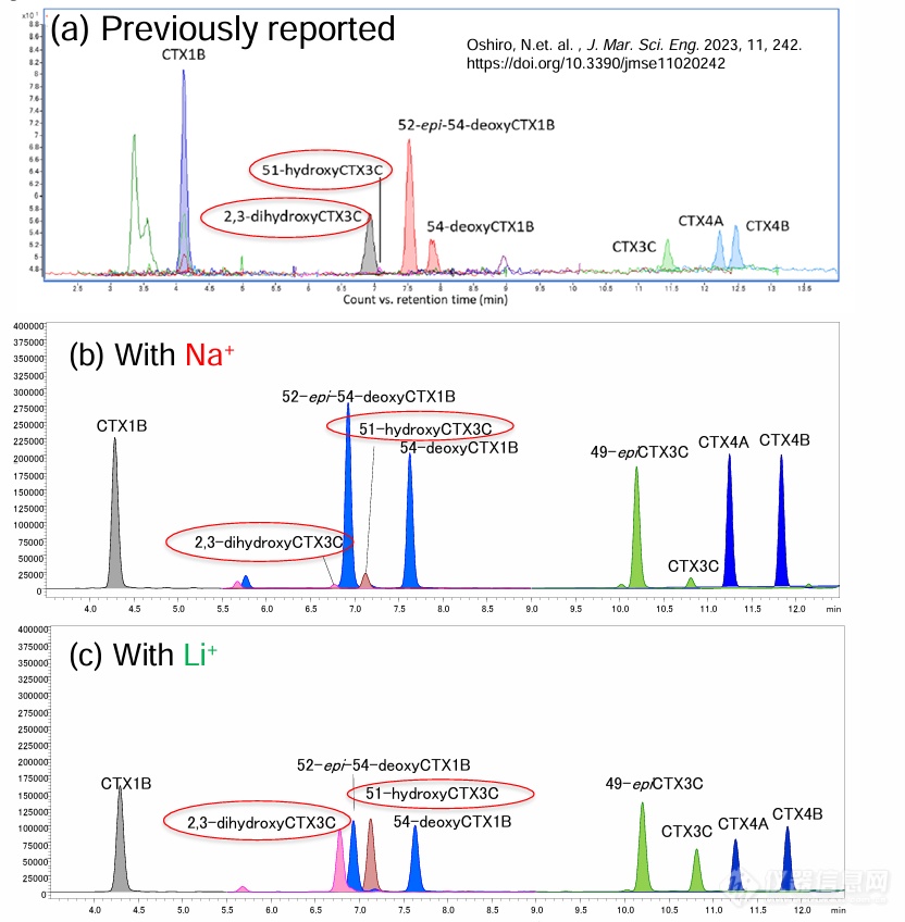 在下图中,比较了使用文献方法、添加Na的流动相(b)和添加Li的流动相(c)对目标化合物的分离。2,3-dihydroxyCTX3C和51-hydroxyCTX3、49-epi-CTX3C和CTX3C、CTX4A和CTX4B在新条件下表现出明显更好的分离。除2,3-dihydroxyCTX3C和51-hydroxyCTX3外的6种类似物和CTX3C在加Na流动相中具有良好的灵敏度。实验证实,使用添加Li的流动相时,9 种CTX类似物的灵敏度相当。