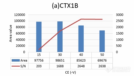 但是,[M+Na]+和[M+Li]+母离子没有提供任何有用的产物离子,因此优化CE用以监测[M+Na]+>[M+Na]+或[M+Li]+>[M+Li]+在MRM分析模式下提供***高的信噪比。CTX1B的优化CE如下表所示。其余8种类似物的***佳CE以类似的方式进行了优化。