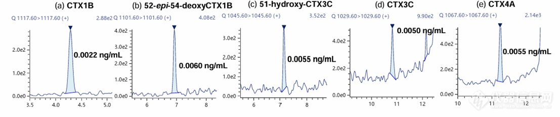 使用JFRL标准品生成校准曲线,以确认[M+Li]+> [M+Li]+ 。校准曲线***低点的每个色谱图如下图所示。确定校准曲线的范围,使每个校准点的3次重复分析的平均准确度为100±5%,并指定***低点作为 LOQ。用5 g鱼肉制备1 mL测定溶液时,5种标准品的LOQ范围为0.0004至0.0012μg/kg。