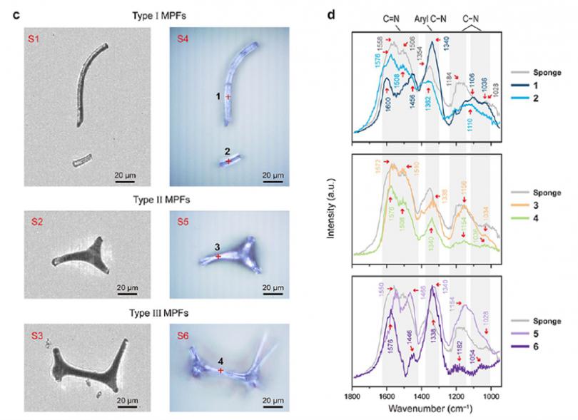 O-PTIR光谱点1 - 4与未磨损海绵的O-PTIR光谱不同。海绵的碳氮双谱带(1558和1506 cm−1)在MPFs(范围从1600到1456 cm−1)中表现出增宽,相对强度略有变化。MPF上1340 cm−1(芳基C-N带)与1558 cm−1(C-N带)的吸收强度之比增加或减少。此外,在磨损海绵的洗涤沃茨中检测到较小的微塑料碎片(3 - 10 μm)(图e),其O-PTIR光谱(图d,点5和6)与长I型MPF(图d,点1)相似。摩擦热不会导致MPF上的聚合物分解,因为海绵磨损期间金属表面的温度升高(从21.5 ° C至24.9 °C)低于三聚氰胺热解引发的阈值(379−387°C。然而,在海绵中存在水和甲醛残留物的情况下,机械能可能通过缩醛胺基团(− NH-CH2-NH-)和羟甲基基团(− NH-CH2-OH)之间的交替水解和缩合反应,诱导破坏或形成三聚氰胺-三聚氰胺交联。