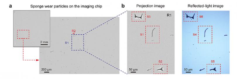 日常使用的清洁海绵由三聚氰胺和甲醛的聚合物制成,在使用过程中,会磨损产生环境微塑料纤维(MPFs)。苏宇老师和其合作者购买了三个知名品牌的清洁海绵,反复在不同粗糙度的金属表面摩擦,通过非接触亚微米分辨红外拉曼同步测量系统—mIRage等多种技术手段表征了海绵的结构组成和释放的MPF。结果发现,海绵的密度对微塑料释放有显著的影响,密度越大,微塑料纤维的释放量越少。