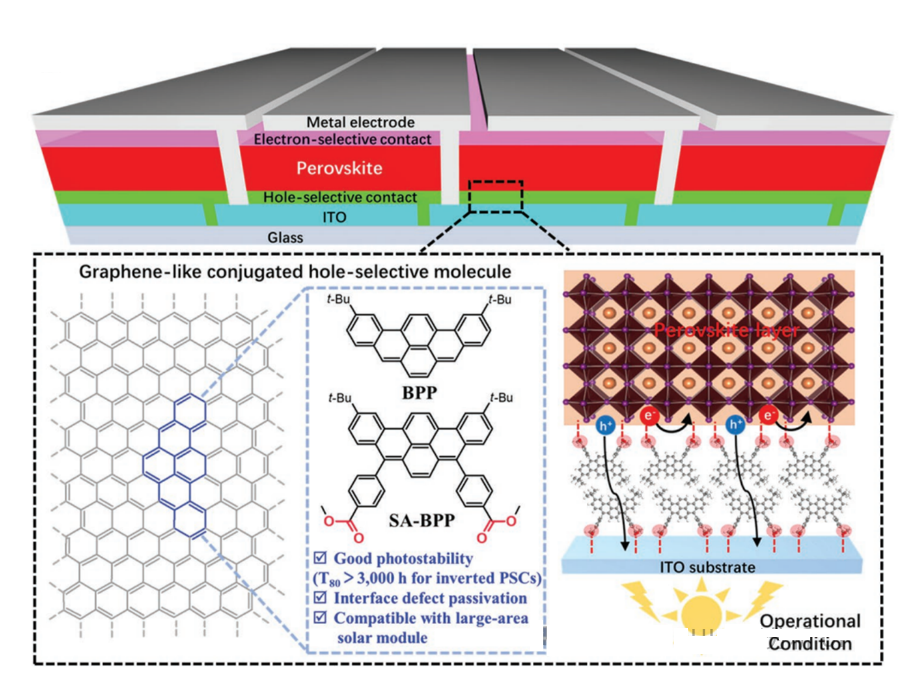 钙钛矿吸收层与空穴传输层之间界面的相互作用是影响钙钛矿电池稳定性的关键因素。对此,戚亚冰教授研究团队制备了***种类石墨烯共轭结构的自锚式苯并[rst]五酚(SA-BPP)分子,用以替代传统的三苯胺和咔唑基的空穴选择性分子,成功开发了新型的空穴选择性接触层。研究表明,使用SA-BPP制备的IPSCs具有更高的光稳定性和光电转换效率。此外,SA-BPP分子结构中的锚定基团还可促使ITO基底上形成大规模的均匀的空穴接触,并有效地钝化钙钛矿吸光层。