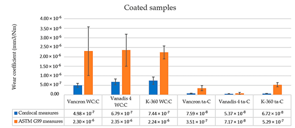 图5:通过ASTM G99标准(橙色图)和共聚焦(蓝色图)测量的样品磨损系数值的比较图。