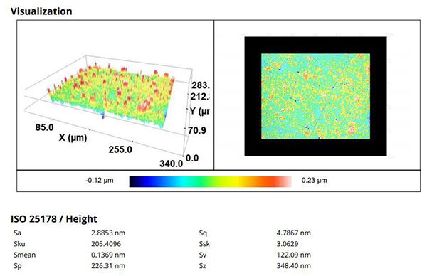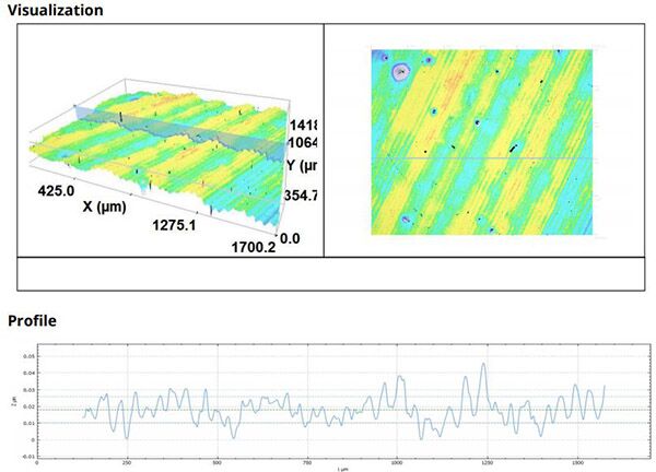 此外,还可以轻松测量样品的表面粗糙度和轮廓粗糙度,然后对比使用共聚焦和干涉测量这两种不同的测量技术获得的数值。通过这种方式,可以保证得到的粗糙度值的精度。基材的粗糙度可能是涂层与基材之间附着力的决定因素。