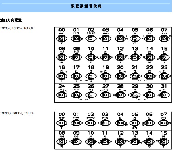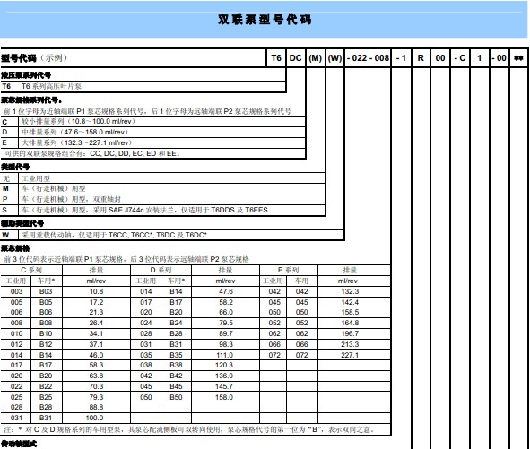 美***丹尼逊Denison公司,生产销售的丹尼逊柱塞泵有以下几大类型可供选择:1、PV系列和PVM系列:螺纹连接式,进出油口在尾部,PV:工业用,PVM:行走机械用(高速)。2、PVT和PVR系列:开式回路用泵,侧面油口,4螺栓,SAE法兰连接,尾驱动备选,PVT:工业用,PVR:行走机械用(高速)。3、Premier 相系列:开式回路用泵,公制尺寸,(全功率)尾驱动备选。4、Worldcup 杯系列:开式回路用泵,尾驱动备选。5、Goldcup金杯系列:闭式回路用泵,控制功能集成化,(全功率)尾驱动备选,其他型式2备选。DENISON生产销售的丹尼逊叶片泵有以下几大类型:1、中等载荷:单联TB系列。2、工业用及行走机械用:单联T7B(S),T6C,T6D,T6E 系列。双联T7BB(S),T67CB,T6CC,T67DB,T6DC,T6DDS,T67EB,T6EC,T6ED 系列。三联T67DBB,T67DCB,T6DCC,T67DDBS,T6DDCS,T67EDB(S),T6EDC(S) 系列。单联尾驱动T6CR,T6DR,T6ER 系列。双联尾驱动T6EE(S) 系列。三联尾驱动T6DCCR, T6EDCR 系列。3、混合型:双联T6H20B,T6H20C,T6H29B,T6H29C,T6H29D 系列。