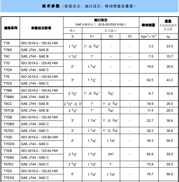 DENISON丹尼逊T7B, T6C, T6D, T6E系列单联叶片泵 高工作压力从190bar至320bar可选, 大排量从40ml/rev至269ml/rev可选。泵的重量从7.0Kg至43.3Kg。此系列叶片泵主要用于工业和行走机械。