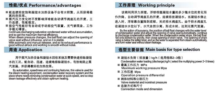 CS41H自由浮球式蒸汽疏水阀的结构简单,内部只有 个精细研磨的不锈钢空心浮球,既是浮子又是启闭件,无易损零件,使用寿命很长。装置刚起动时,管道内出现空气和低温冷凝水,手动排空气阀能迅速排除不凝结气体,疏水阀开始进入工作状态,低温冷凝水流进疏水阀,凝结水的液位上升,浮球上升,开启阀门。装置很快提升温度,管道内温度上升到饱和温度之前,自动排空气阀已经关闭;装置进入正常运行状况,凝结水减少,液位下降,浮球随液位升降调节阀孔流量;当凝结水停止进入时,浮球随介质流向逼近阀座,关闭阀门。自由浮球式蒸汽疏水阀的阀座总处于液位以下,形成水封,无蒸汽泄漏。