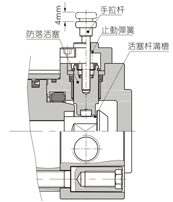 将手拉杆拧入防落活塞,并用20N 以上的力将螺栓拉出4mm,防落活塞移动后便可解除锁定。(无负荷水平安装时或相反侧气口加压时)或者,松手之后,防落活塞通过止动弹簧的作用返回到原始位置并进入到活塞杆沟槽中,活塞变成锁定状态。
