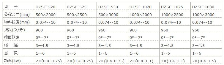 DZSF系列直线振动筛为双振动电机驱动。当两台振动电机做同步、反向旋转时,其偏心块所产生的激振力在平行于电机轴线的方向相互抵消,在垂直于电机轴的方向叠为 合力,因此筛机的运动轨迹为 直线。两电机轴相对筛面在垂直方向有 倾角,在激振力和物料自重力的合力作用下,物料在筛面上被抛起跳跃或向前作直线运动,从而达到对物料进行筛选和分 的目的。适用于粒度在0.074—5mm,含水量小于7%,无粘性的各种干式粉状或颗粒状物料的筛分。给料粒度不大于10mm.。