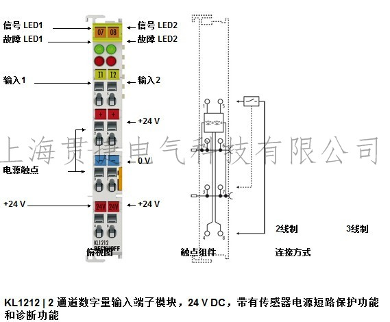 KL1212 数字量输入端子模块从处理层获得二进制控制信号,并以电气隔离的形式将这些信号传输到更高层的自动化单元。KL1212 可为传感器提供 24 V DC 短路保护电源电压。控制器可以控制传感器输出的开关状态。可监测传感器电源的短路或开路情况,端子模块状态通过 K-bus 传到控制器。每个总线端子模块含有 2 个通道,每个通道都有 个 LED 用来显示其信号状态和故障信息。
