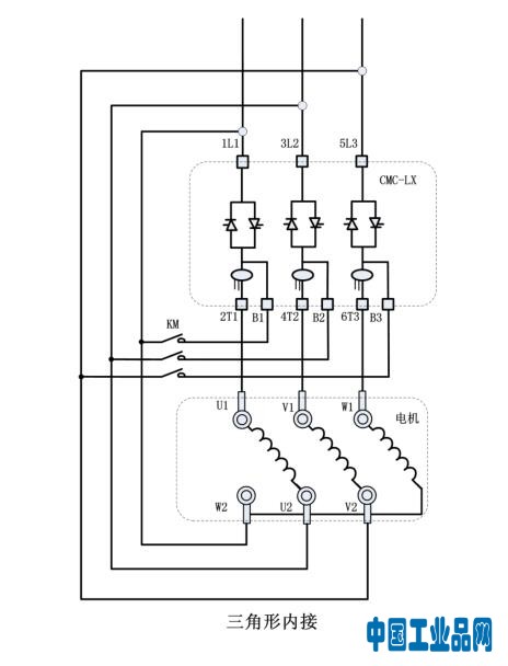 若用户使用三角形内接连接时,用户必须严格按照下图进行连接,否则有可能导致电机或软起损坏。本机在启动前会对电机接线进行判断,若接线错误软起会报接线错误故障。