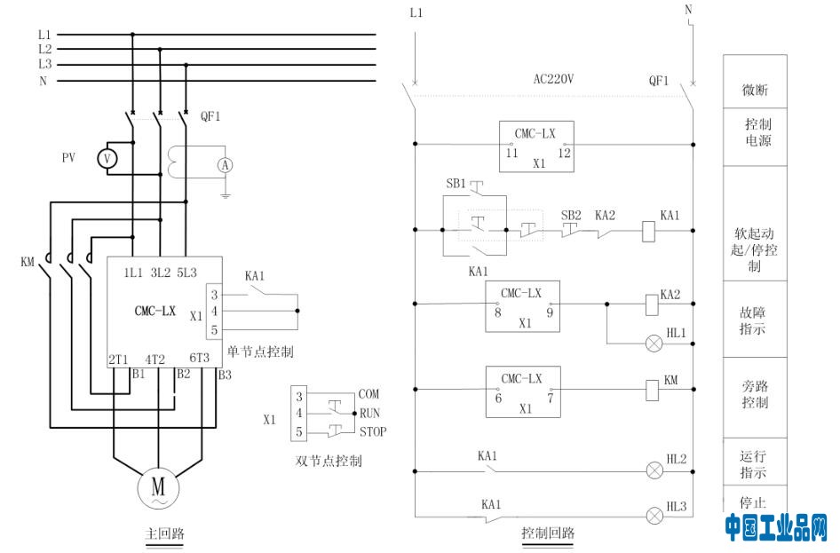 ①、上图所示为单节点控制方式。接点闭合软起动起动,接点打开软起动器停止。但要注意这种接线LED面板起动操作无效。端子3、4、5起停信号是 个无源节点。