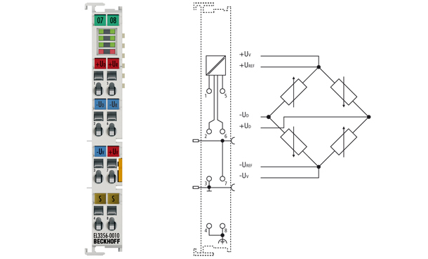 The analog EL3356-0010 input terminal enables direct connection of a resistor bridge or load cell in a 4- or 6-wire connection technology. The ratio between the bridge voltage UD and the supply voltage UREF is determined simultaneously in the input circuit and the final load value is calculated as a process value on the basis of the settings in the terminal. With automatic self-calibration (can be deactivated), dynamic filters and distributed clock support, the terminal with measuring cycles of 100 µs can be used for fast and precise monitoring of torque or vibration sensors.