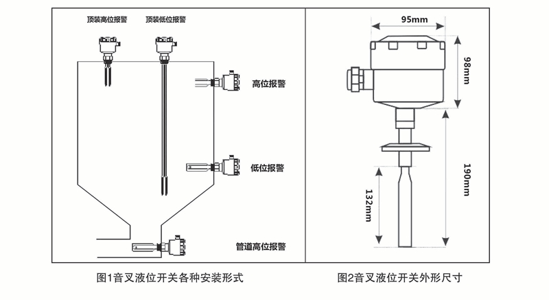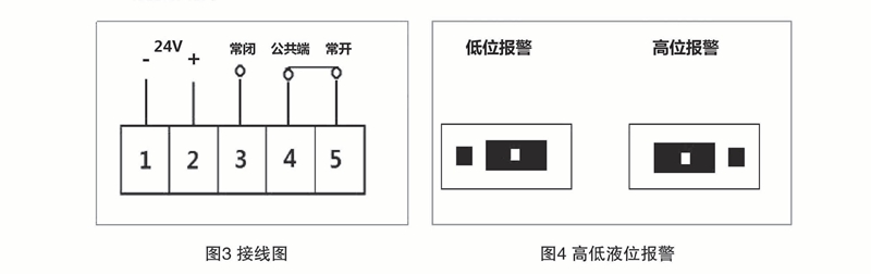 ●音叉开关接线:图3中1和2接线端为电源接线,仪表选型时24V和220AC可选,3和4为常闭接线端,4和5为常开接线端。