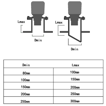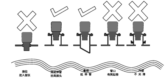 若液位/物位能进入仪表的盲区,则需安装延伸管抬高探头的安装高度。延升管的直径、长度应符合仪表的要求。