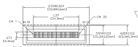 A5V-35UV以双列直插共40 pin DIP封装,其中有35个二极管探测器,因此也就有35个信号输出引脚,还包括2个地引脚以及3个空脚。每个二极管探测器宽为0.9 mm ,高为4.4mm ,相邻探测器间隙为0.1mm, 探测器间距为1mm。其封装尺寸与市面上的主流品牌完全兼容.