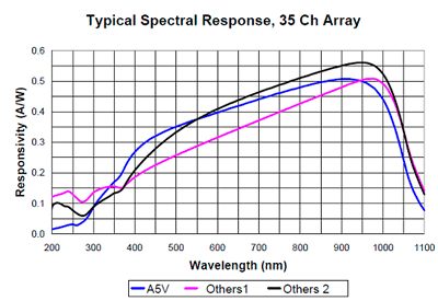 A5V-35UV在340nm处的响应度可达到0.15A/W ,在400nm左右更可达到0.27A/W,比其它品牌好,这对于提高信噪比和后续的信号处理分析有非常重要的意义.如下是几种探测器的响应度比较.