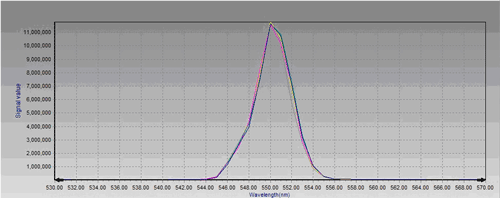 可调单色光源输出单色光重复性测试(550nm,重复调节5次的光谱测试图)